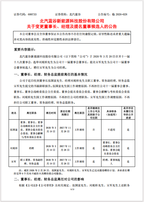 就在一年多之前的2025年3月18日,北汽蓝谷公告人事任命:张国富任董事长,刘观桥升任总经理。