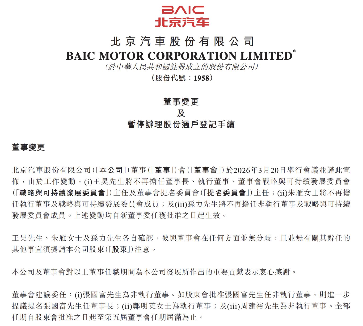 北汽股份的公告宣布:由于工作变动,王昊不再担任公司董事长、执行董事等多项职务,朱雁、孙力分别辞去相关董事及委员会职务,变动自新董事委任获批之日起生效。