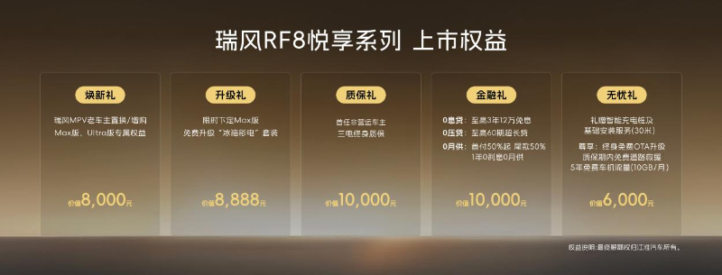 此次上市的瑞风RF8悦享系列共推出三个版本:悦享Pro版限时抢购价17.69万元,悦享Max版限时抢购价21.19万元,悦享Ultra版限时抢购价22.69万元。同时,瑞风为首批用户准备了至高价值70888元的7重尊享购车大礼,并为老车主提供免费升级原厂车钥匙或HiCar智慧车生活、1666元升级原厂NVH静音包的双重专属感恩权益。