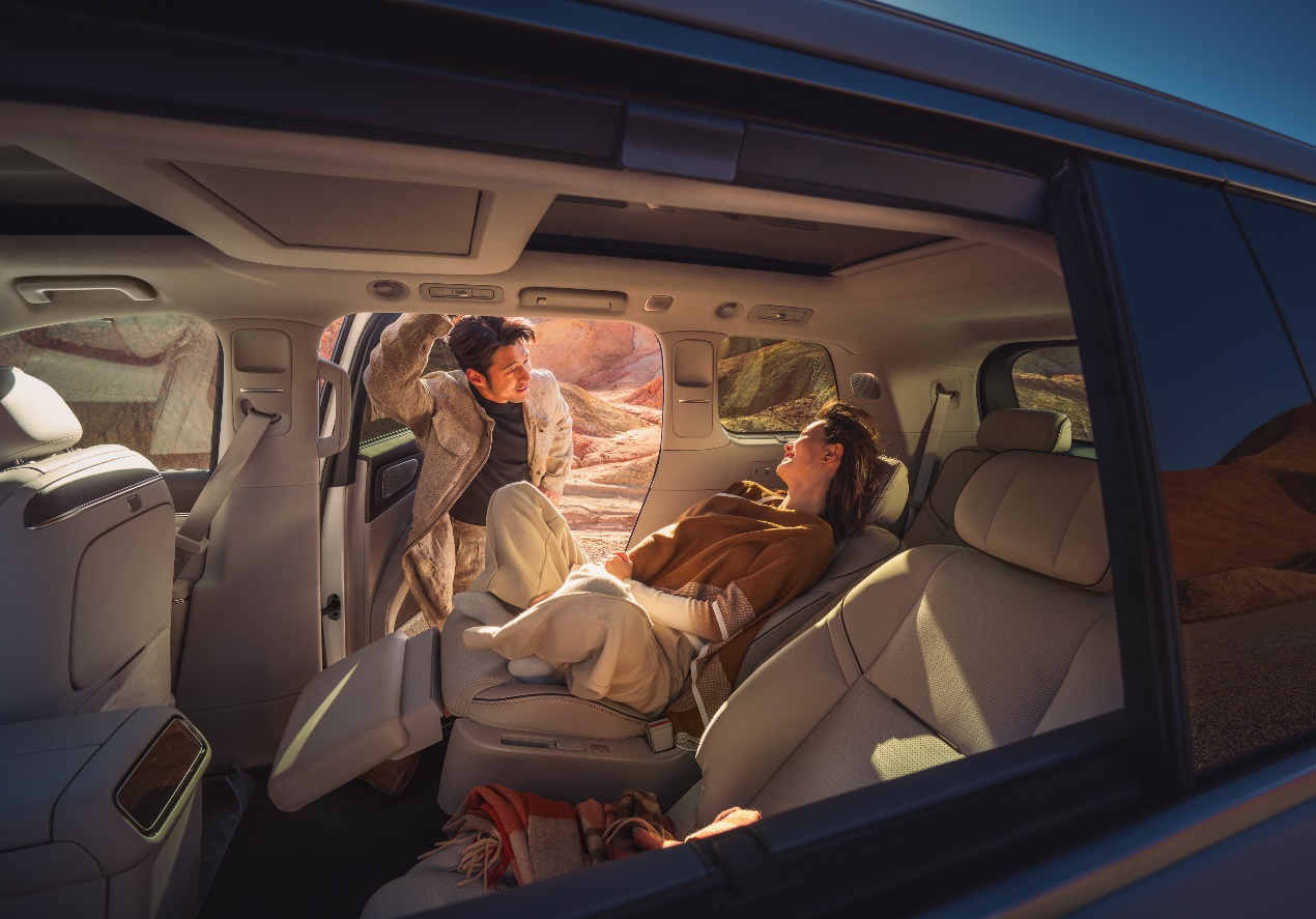 座椅采用12层奢享级结构,全车座椅支持电动调节,并实现6座加热、4座吸入式通风与10点式按摩,二排右侧零重力座椅支持120°零压躺姿、4向腿托与ABTS一体式安全带,1.9米乘员也能享受悬浮式休憩体验。第三排为同级超大贵宾座,支持131°靠背无极调节、座椅加热与一键电动翻折,搭配专属双扶手与全平地台,彻底解决传统三排“小板凳”痛点。此外,二/三排专属遮阳帘遮蔽率分别达93.2%、91%,全方位兼顾舒适与隐私。