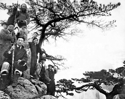 徐悲鸿(下坐者)与张大千(上坐者)带学生赴黄山写生。