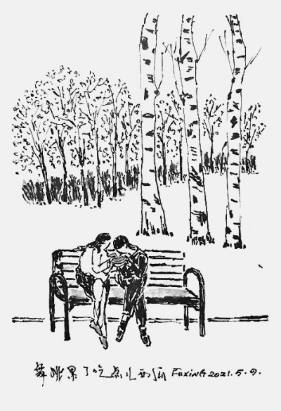 我看清了,男的洁白的衬衫塞进裤腰里,外套一件砖红色西式马甲,颇为鲜艳;女的黑色高领束腰毛衣,黑色阔腿曳地长裤,黑精灵一般一身黑。两人的头发都是新染的,黑亮如漆,一丝不苟。别看动作迟缓,衣着却笔挺讲究。我还看到,他们手的姿势很是特别,女的右手在胸前紧紧握住男的一只手,左手则拐向自己的身后,紧紧地握着男的伸到她后背的另一只手。这样的姿势,在所有的舞姿中绝无仅有,对于女的来说难度很大。男的像是中风后有些偏瘫,她是担心他跌倒。显然,她希望舞蹈有助于他恢复身体,更可能是帮助他回忆曾经美好的年月。他们紧紧地贴在一起,女的手更是紧紧地抓住男的手,仿佛只要一松手,男的就会像一片叶子被风吹走。