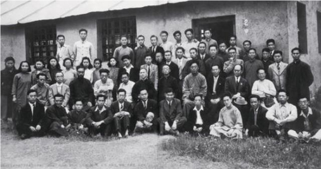 1946年5月3日 西南联大中文系全体师生在教室前合影 二排右一为沈从文 图片选自汪曾祺《人间草木》