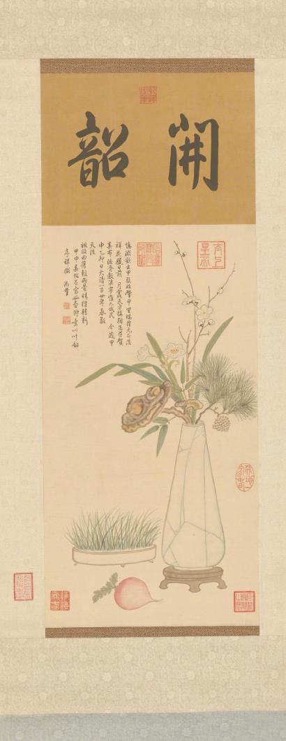 如果说消寒图是一首迎春序曲,那么岁朝图就是一首首悦春的交响曲了。明清两代,岁朝清供题材极为盛行,图式基本是瓶供鲜花与散放的时鲜蔬果彼此搭配,兼工带写,众采备家之长,以疏淡简逸的笔墨表达春日趣味。