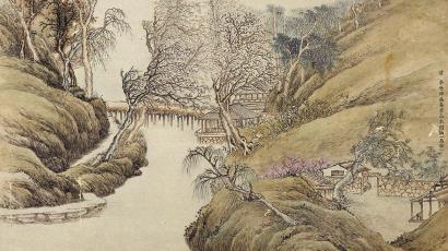这样的画面,也会让人想起苏轼的《惠崇春江晚景》:“竹外桃花三两枝,春江水暖鸭先知。蒌蒿满地芦芽短,正是河豚欲上时。”这首诗据说是东坡为惠崇《溪山春晓图》所题。惠崇,宋初画家、诗人、僧人,工画鹅雁鹭鸶,寒汀远渚,世称“惠崇小景”,其画属南方山水画派支流,意境虚和萧散,独创新风,但不为时人所重。惠崇的《溪山春晓图》,现藏于北京故宫博物院,画中布局取平远之势,但叠岭崇山,云气蒸腾,亦显深幽境界,萦绕于山间的河流、湖水与云气融为一片,又使其境空灵渺远。惠崇的笔法温和平淡,近山、林木等勾皴外,山石多以染法,随形变化,浓淡相宜。此画敷色简淡,醒目异常,更增强了画面春日融融的明丽气氛。