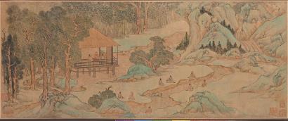 北京故宫博物院藏文徵明绘兰亭修褉图卷,描绘了东晋王羲之《兰亭序》中的景象,画中林木荫翳,丛竹泛翠,春色浓得醉人
