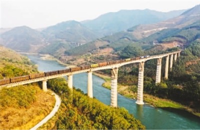 火车开行在南盘江铁路大桥上(无人机照片)。新华社记者 张爱林摄