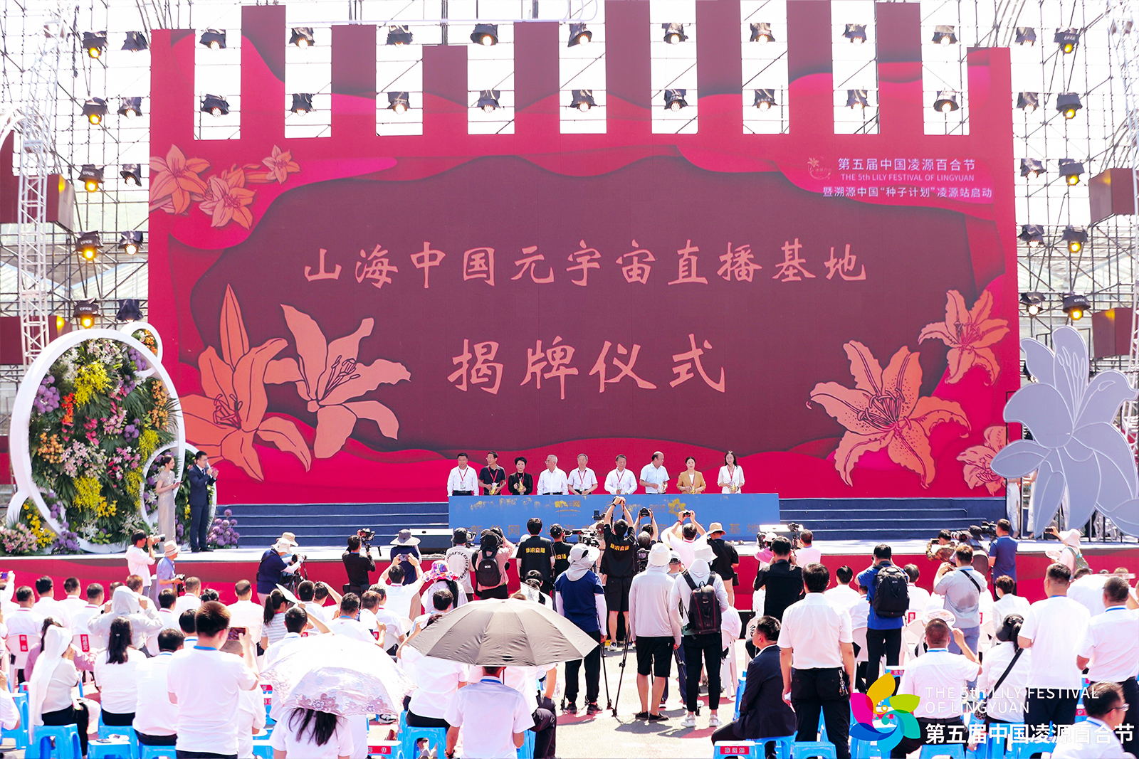 6月18日,第五届中国凌源百合节于辽宁凌源中国百合博览园开幕。本届百合节以“百合绽放美好生活”为主题,汇聚产业发展磅礴力量,以数字化赋能乡村振兴。图为新华网“山海中国”元宇宙直播基地揭牌仪式。 pagebreak
