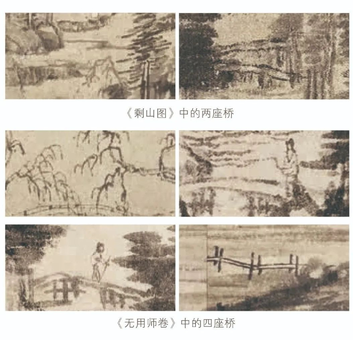 《富春山居图》全卷共画有六座桥,其中《剩山图》上有两座桥,《无用师卷》上有四座桥。让我们先找到其中的一座桥,它在梁诗正书写的“鉴定”开头部分正下方。你有没有发觉,这座桥最为特殊。