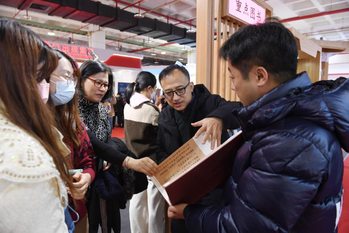 1月11日,一名参展商工作人员(右二)在订货会现场介绍书籍。