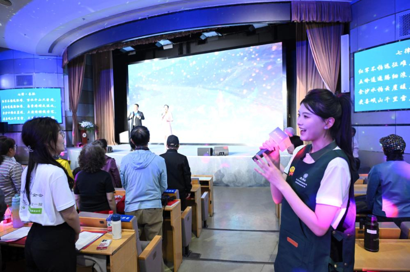 5月10日,中国传媒大学大学生志愿者在活动现场带领嘉宾朗诵诗词。
