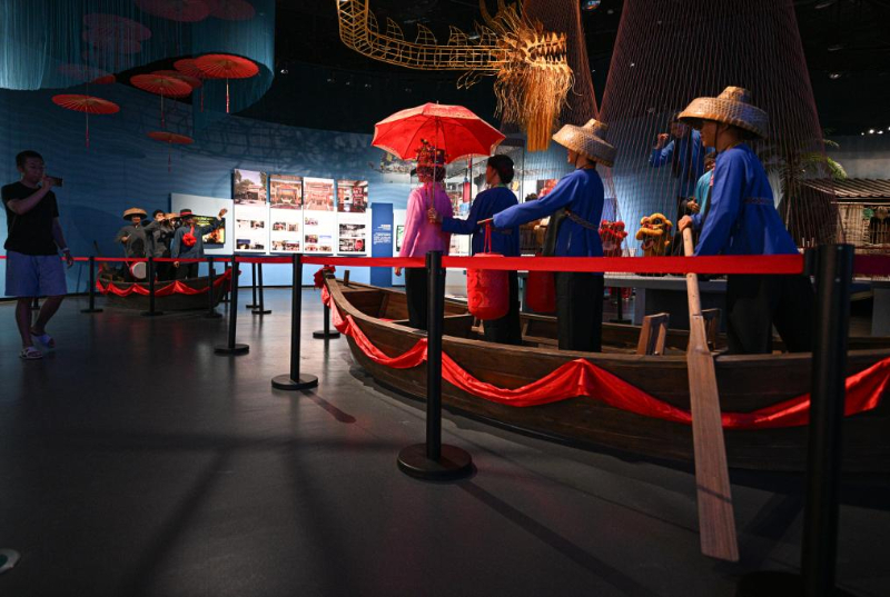 5月13日在海南疍家博物馆拍摄的展示疍家人举行水上婚礼的场景。