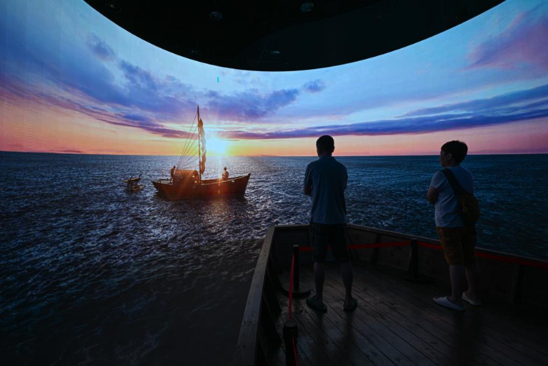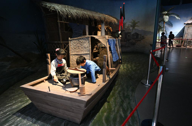 5月13日在海南疍家博物馆拍摄的展示疍家人生活在住家船上的场景。早期疍家人大多居住在船上,每户一般有一至两艘船用于作业和居住。