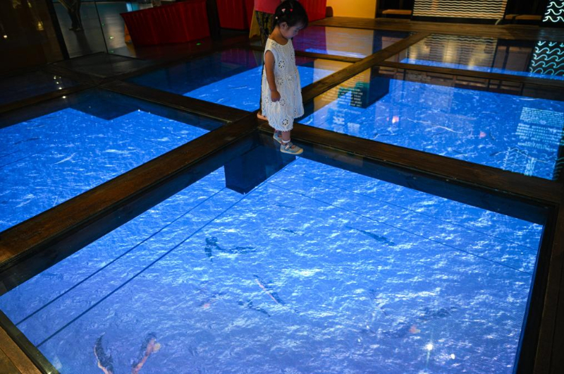 5月13日,游客在海南疍家博物馆观看展现疍家渔排底部水产养殖的动画。