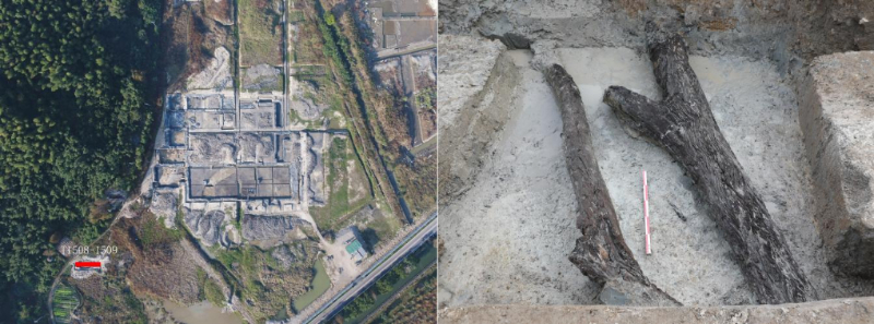 施岙遗址位于浙江余姚,考古队员在这里发现了两段并排分布的树木枝干。经测定,出土古树约为公元前2520年,属于良渚文化时期。