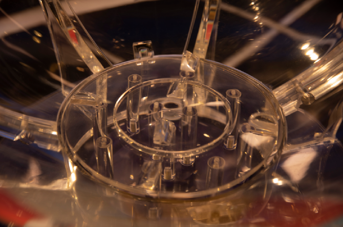 双色球摇奖机上半部分由号码球预览架、球状搅拌室及出球轨道组成,其材质为高透光性有机玻璃,这种材质的优点在于透光性好、硬度高、耐磨、耐腐蚀,整个摇奖过程观众和公证人员都可以看得清清楚楚。