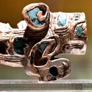 这是2024年2月23日拍摄的河南安阳殷墟博物馆新馆内展出的嵌绿松石骨虎。