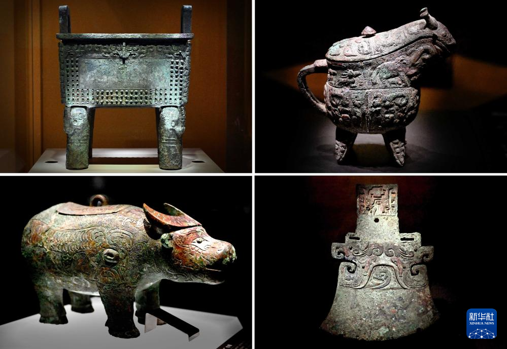 这是2024年2月23日拍摄的河南安阳殷墟博物馆新馆内展出的“司母辛”铜鼎(左上)、“亚长”铜觥(右上)、“亚长”牛尊(左下)、“亚长”铜钺(拼版照片)。