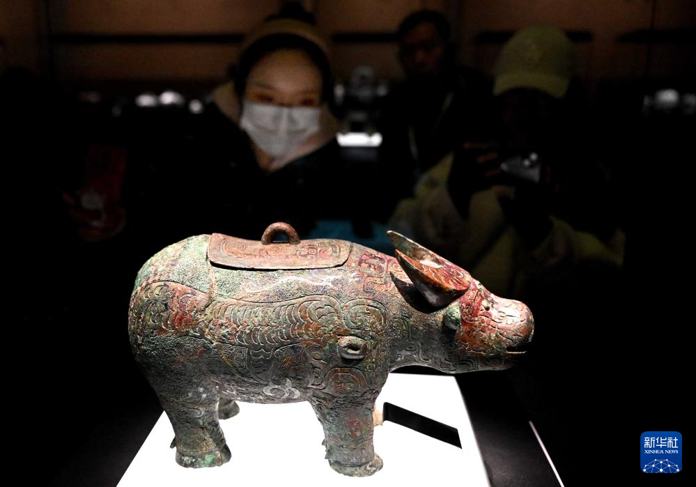 2024年2月26日,参观者在河南安阳殷墟博物馆新馆内观看展品“亚长”牛尊。