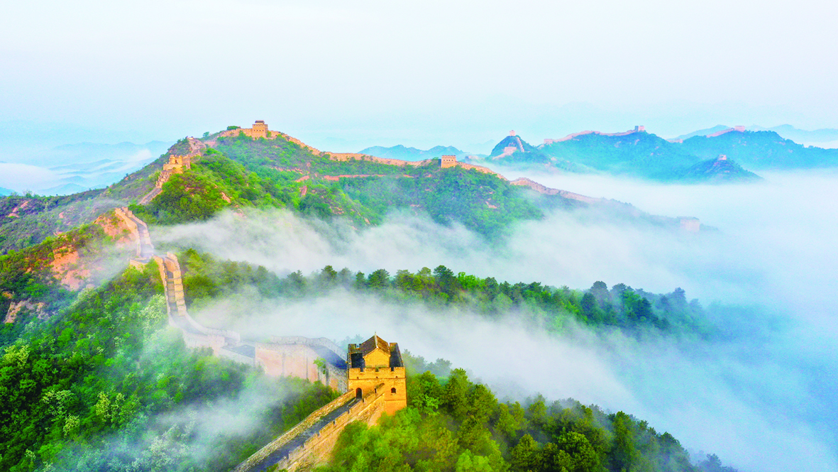 初夏细雨过后,朦胧雾气升腾,金山岭长城在崇山峻岭间曲折蜿蜒、若隐若现,像一条巨龙横卧在群山之巅。