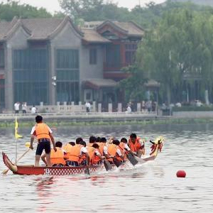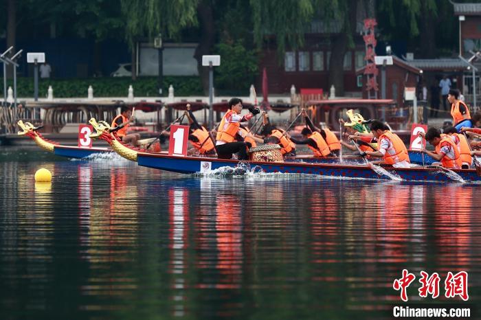 开幕式后,来自大运河流经多个省份及清华大学、北京大学、通州区、昌平区的12支龙舟队在什刹海同场竞技,仲夏争时。