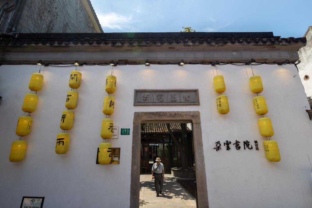 枫泾古镇有39座始建于元明清时期的古石桥以及近5万平方米的古建筑群,既有修旧如旧的静态保护,也有文化铸魂的活态传承。古镇核心区中大街上的王氏老宅外立面还是小青瓦、观音兜、屏风墙,里面也维持着三进合院式布局,现由集书房、展厅、咖啡、文创于一体的朵云书院运营。出门走不远,另一座老宅被改造成枫泾丁蹄非遗文化展示馆,展示了当地丁蹄制作的传统技艺,既带领人们探寻舌尖上的文化之旅,也实实在在帮古镇各处售卖枫泾丁蹄的本地商户“带货”。
