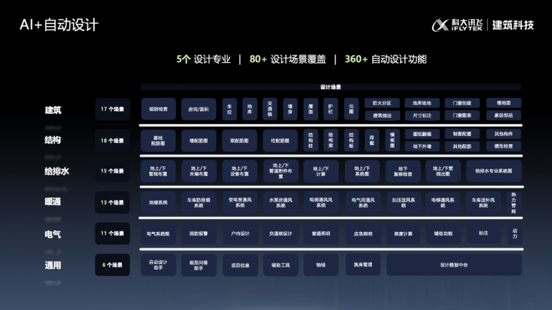 设计是智慧性思考,也是标准化施工。施工图设计是建筑数据的交换核心,此次发布的AI+自动设计产品借助大模型算法赋能与大数据融合流程再造,覆盖全专业和多场景,最终集成360+项自动设计功能,具备多个可一键生成三维模型和二维图纸的自动设计能力。