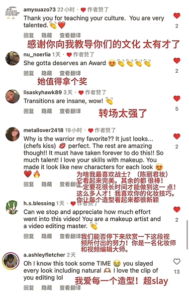 起先“宽宽”还会担心,国际友人可能没办法完全理解中式美学,没想到恰恰相反,这条视频竟然在外网上大受好评。他们在评论区留言:“太厉害了”“太有才华了”“转场太强了”“最喜欢战士妆(陈丽君妆)”“对中国服装感兴趣,要链接中”……