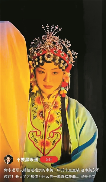 博主@不要黑眼圈制作过一条融入京剧元素的“中式变装”视频。她表示,长大后才真正理解为何老一辈喜爱戏曲。