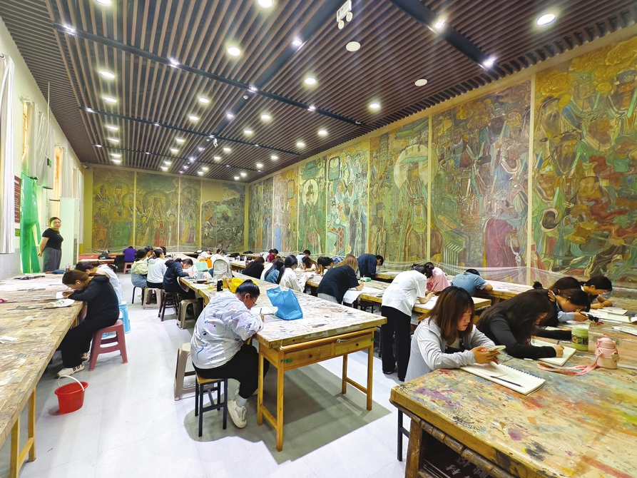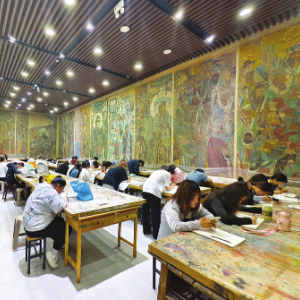 学生在永乐宫壁画临摹室临摹壁画。周明飞摄