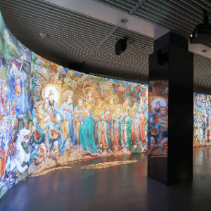 永乐宫作为中国现存唯一的元代官式建筑群,以其宏伟壮丽的元代古建筑及满壁风动的壁画闻名于世,遗憾的是,许多历史细节随着岁月流逝逐渐模糊。通过AI技术的深度应用,本次展览完整复原了永乐宫的建筑布局与壁画风貌,观众可以步入数字化还原的永乐宫,置身于七百年前,亲身领略永乐宫的建筑奇迹与历史瑰宝的艺术魅力。