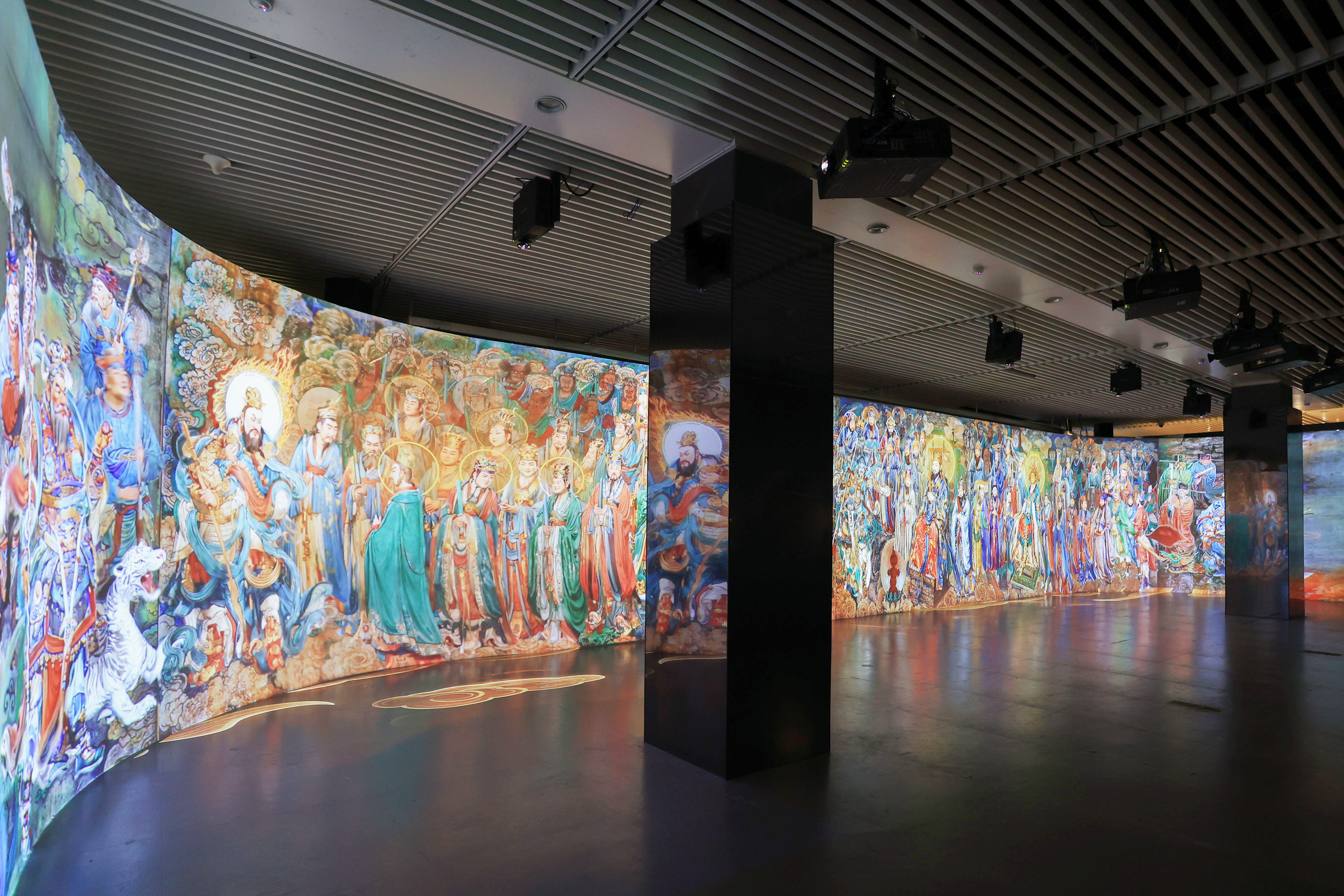 展览特别打造了多处沉浸式互动体验空间,如:行进式弧幕剧场生动再现三清殿壁画《朝元图》的恢弘场景,AI活化的三清殿神祇迎面“飞来”,让观众感受“众神朝元,满壁风动”带来的震撼;数字活化的《纯阳帝君神游显化图》更是让观众步入青绿山水画卷中,与吕洞宾一起“游戏世间”,徜徉在科技与艺术交融的沉浸氛围中。