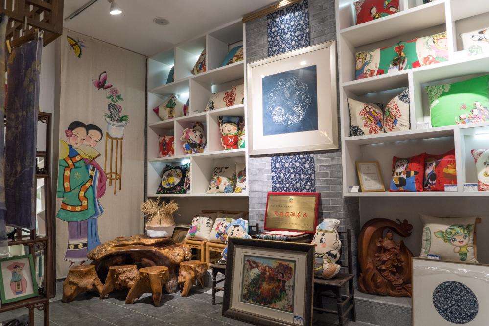 在年画村内,各类年画非遗体验工坊和文创品店鳞次栉比,前来打卡的游客络绎不绝。在一间名为“三彩画坊”的年画体验馆里,不仅能看到传统年画,还能感受年画元素与时尚、日常相融合的文创产品,传统的绵竹年画焕发出浓郁的“文艺范儿”。