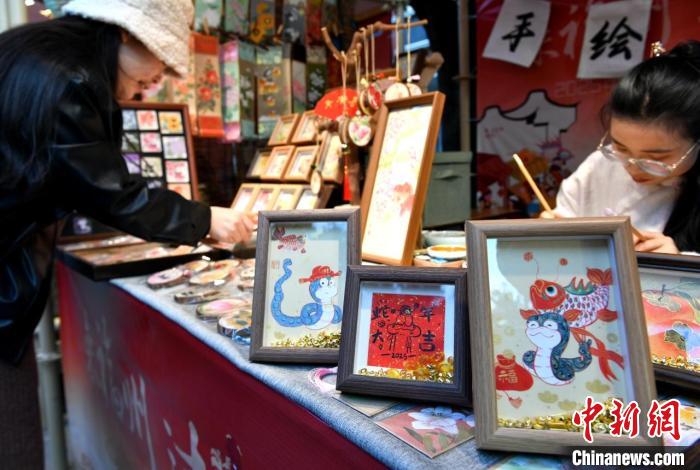 1月17日,在福建福州上下杭历史文化街区举行的新春市集上,游客正在选购蛇年元素文创产品。中新社记者 吕明 摄