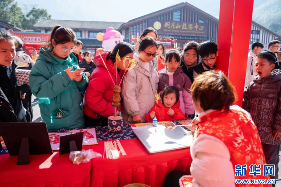 明月山新春游园会活动现场,游客正在观看糖画制作。新华网发