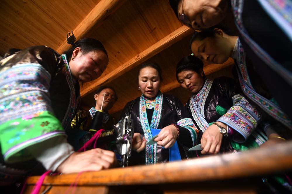 在广西柳州市融水县杆洞乡党鸠村,杨洪英(右四)在指导姐妹们刺绣(3月3日摄)。