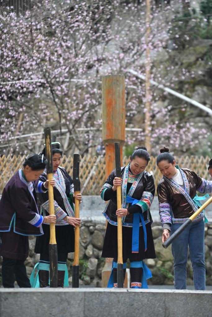 在广西柳州市融水苗族自治县杆洞乡党鸠村,杨洪英(右二)和姐妹们交流传统亮布的制作技艺(3月3日摄)。