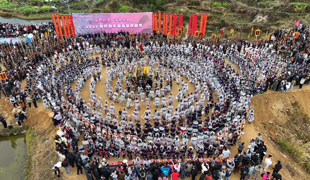 在广西柳州市融水苗族自治县杆洞乡百鸟衣芦笙坡会,各族群众一起跳芦笙踩堂舞。其中有不少人的苗族服饰是杨洪英制作的(2月5日摄)。新华社发(欧明熙 摄) 记者:黄孝邦