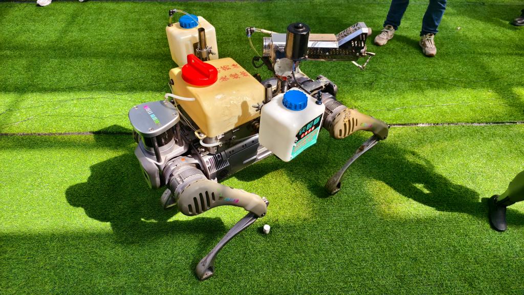 “人不用下地,只要用手机简单操作,机械狗就把打药的活儿包圆了!”在芜湖快螳螂智能设备有限公司的展位上,一款打药机械狗吸引不少游客驻足观看。公司总经理唐小华介绍,这是公司将冷雾机与机械狗结合而成的创新应用,兼具冷雾机高精度滴雾喷射和机械狗灵活性、环境适应性强的优势,既节水又能有效降低化肥和农药用量。