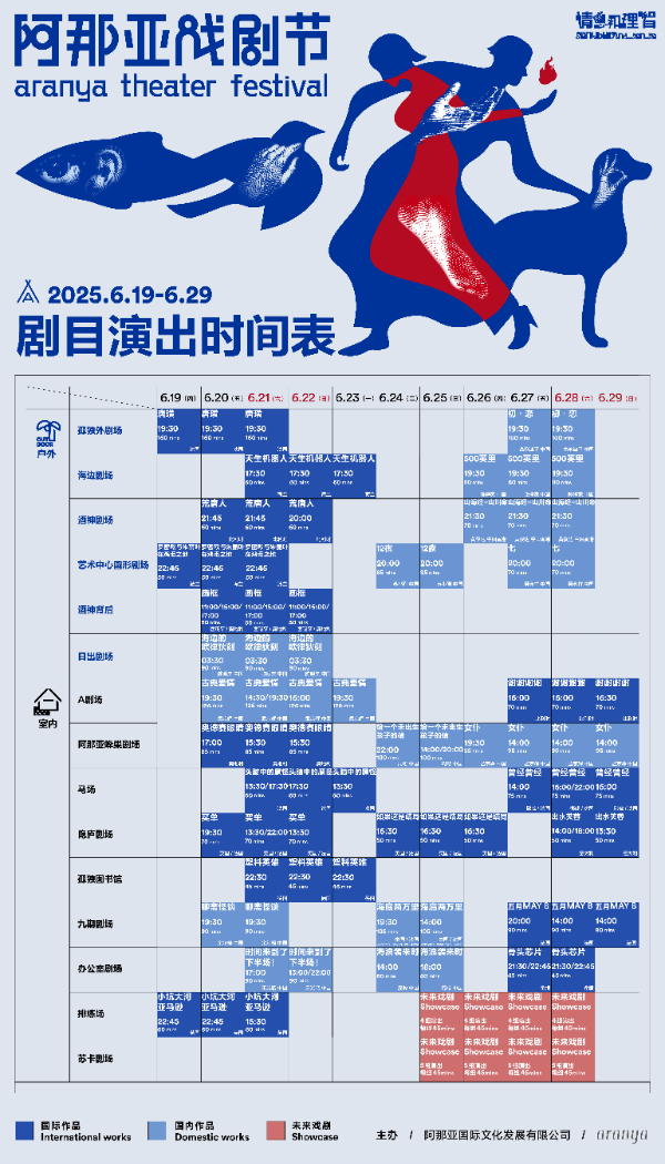 阿那亚戏剧节一直致力于构建展现世界戏剧风貌的平台。今年,来自法国、英国、德国、荷兰、比利时、挪威、意大利、希腊、西班牙、奥地利、波兰等13个国家和地区的16部国际剧坛前沿作品,以及国内13部风格特异、丰富多姿的当代剧作将齐聚阿那亚海边,以“八大戏剧矩阵”呈现潮流戏剧全景。本次戏剧节汇集了40位中外导演,将在15个剧场空间带来94场演出。