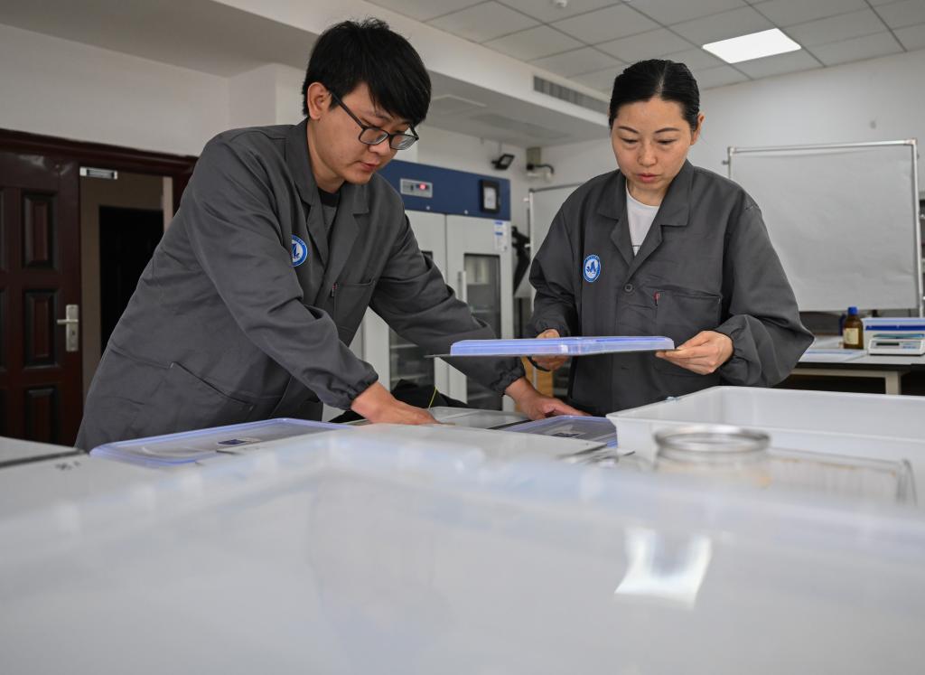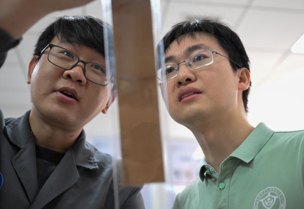 4月24日,在荆州文物保护中心简牍工作室,清华大学出土文献研究与保护中心副教授魏栋(右)查看牍片上的文字。