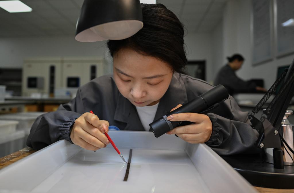 4月24日,荆州文物保护中心简牍工作室工作人员在清理竹简。