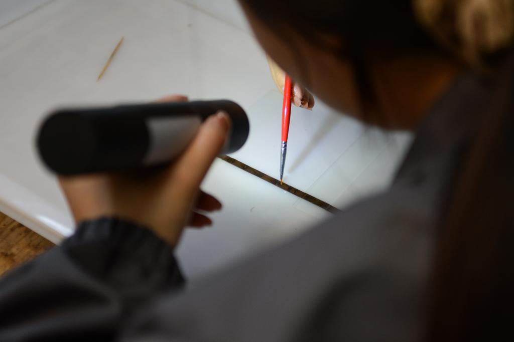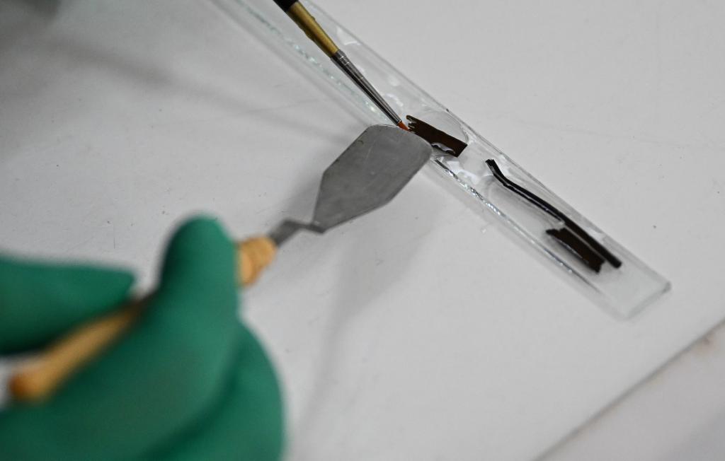 4月24日,荆州文物保护中心简牍工作室工作人员在处理竹简残片。