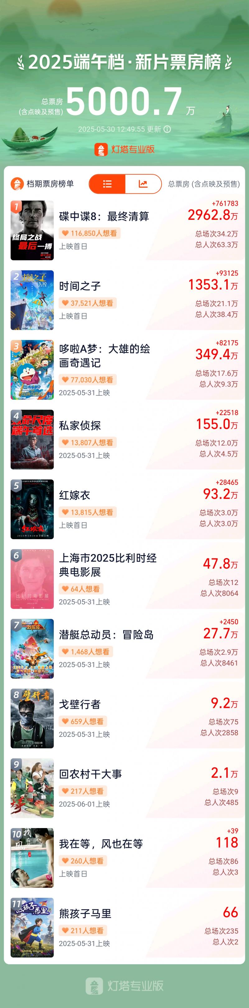 据灯塔专业版,截至5月30日12时49分,2025年端午档新片总票房(含点映及预售)突破5000万。《碟中谍8:最终清算》《时间之子》《哆啦A梦:大雄的绘画奇遇记》暂列前三名。