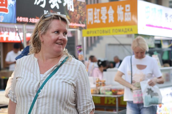 “我非常喜欢这里,夜市的食物非常美味!”来自俄罗斯的游客列拉品尝着烤串,笑容满面。不远处,李岩和孟玲夫妇的烤鸡腿摊前香气四溢,“喜欢黑河,也喜欢和俄罗斯朋友聊天!”李岩用简单俄语招呼着客人。目前,夜市每日人流量平均可达2万人次,年营业额可破亿元。