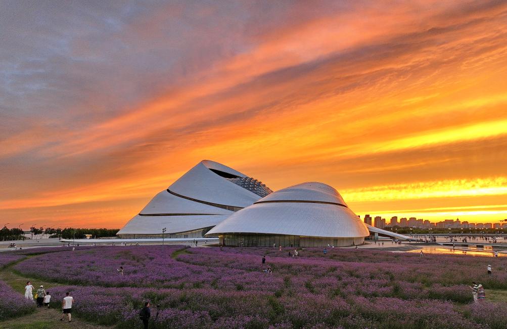 7月20日,在哈尔滨大剧院附近,人们在绚烂晚霞中游玩拍照(无人机照片)。新华社发(杨威摄)