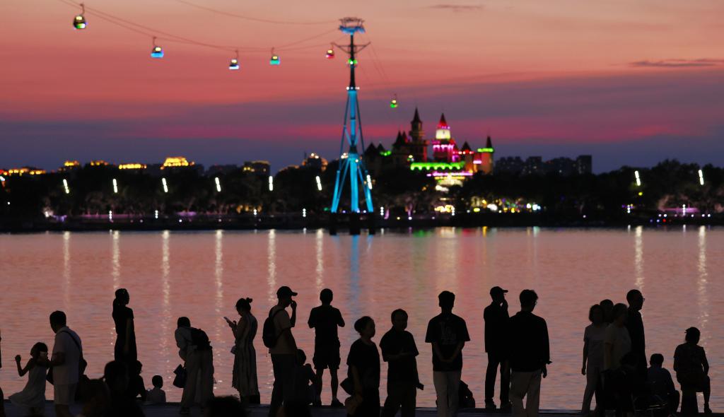 7月25日,人们在哈尔滨市的松花江畔欣赏晚霞。新华社发(张树摄)