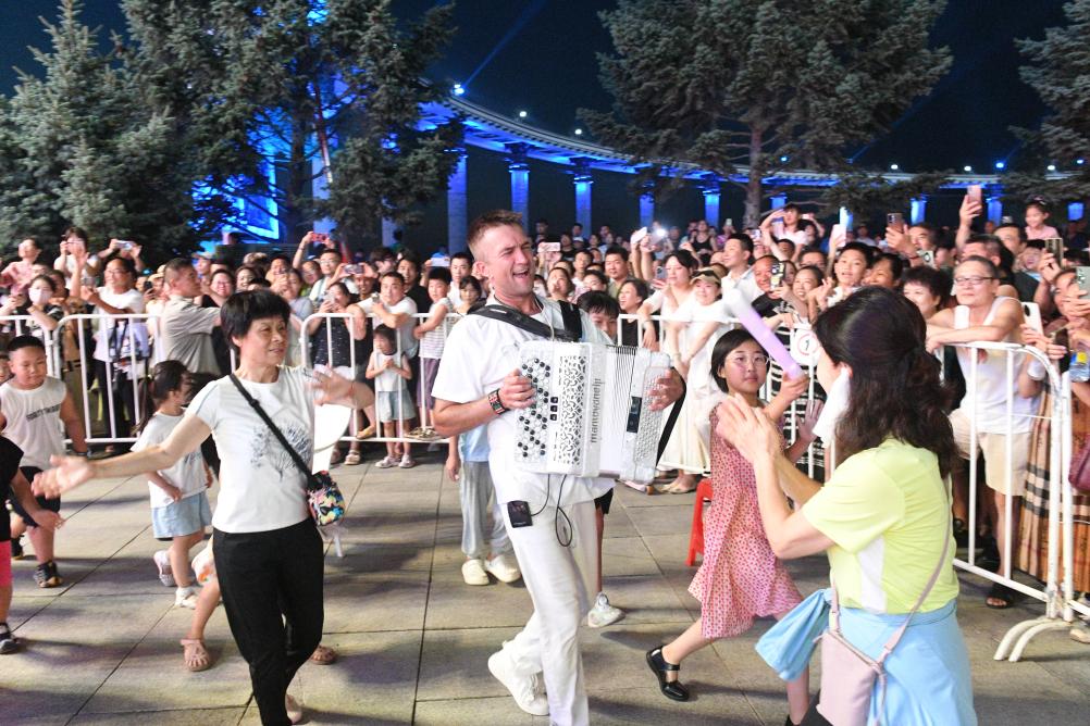7月22日,在哈尔滨市防洪纪念塔广场,游客与来自俄罗斯的手风琴手互动。新华社发(刘洋摄)
