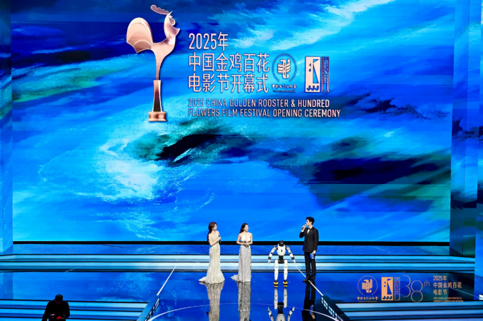 11月11日晚,主持人在2025年中国金鸡百花电影节开幕式现场与机器人互动。主办方供图
