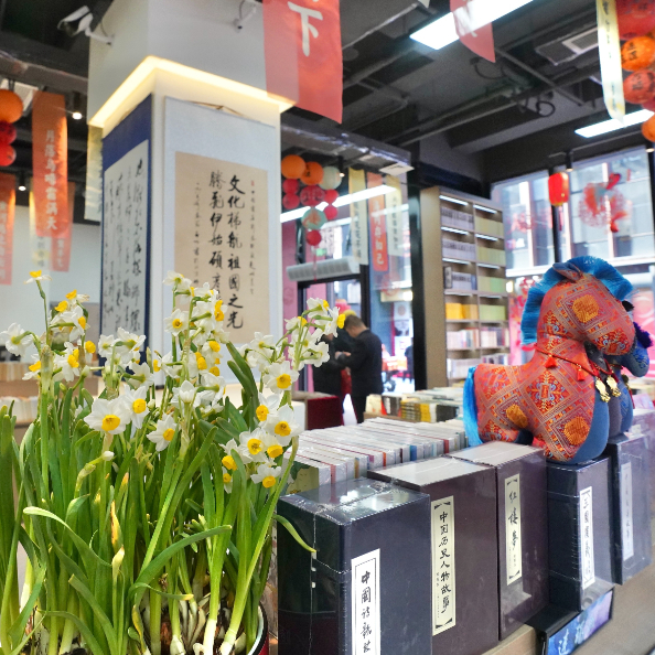 步入店内,书案、桌椅错落有致,配以典雅展架与柔和灯光,营造出“如在书房”的静谧氛围。门店特设读者寄语墙与新春祝福留言区,不少市民读者已写下对新年的期许、对阅读的感悟和对书店的祝福。一位读者写下可爱留言,“马年拥有三种快乐:多巴胺,马上见喜;内啡肽,马到功成;血清素,一马平川”,一位读者则写道,“中国书店,文化之光”。